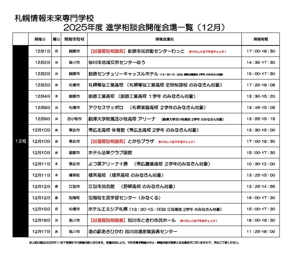 さて、年末を迎えることで慌ただしくなりますが、12月も道内各地で高校生のみなさんを対象とした“進学相談会”が多数開催されます。情報未来も下記の通り道内各地をおじゃましますので、ぜひお気軽にブースまでお越しくださいね!!