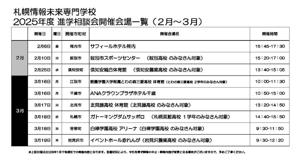 2月&3月も、高校生のみなさんを対象とした“進学相談会”が、道内各地で開催されます。情報未来も下記の通りおじゃましますので、ぜひお気軽にブースまでお越しくださいね!!